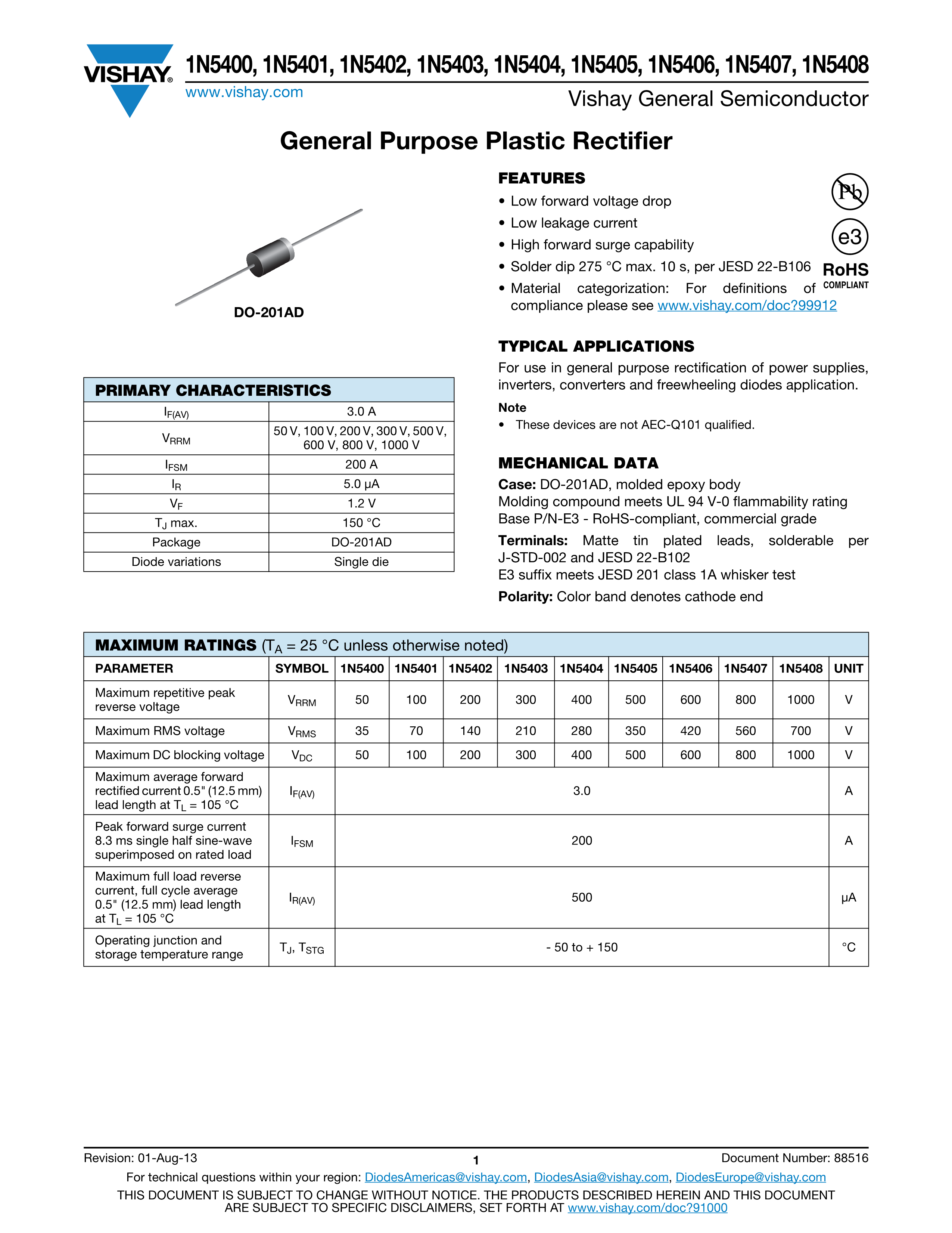 1N5406-E3-54数据手册DO-201AD封装VISHAY(威世)PDF规格书,中英文下载