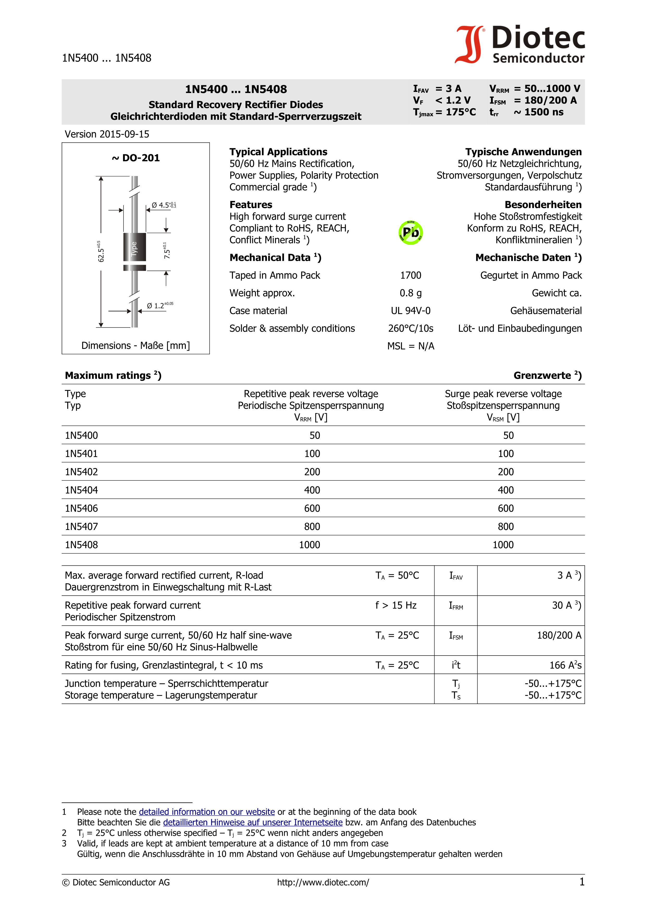 1N5404数据手册DO-201封装DIOTEC(德欧泰克)PDF规格书,中英文下载