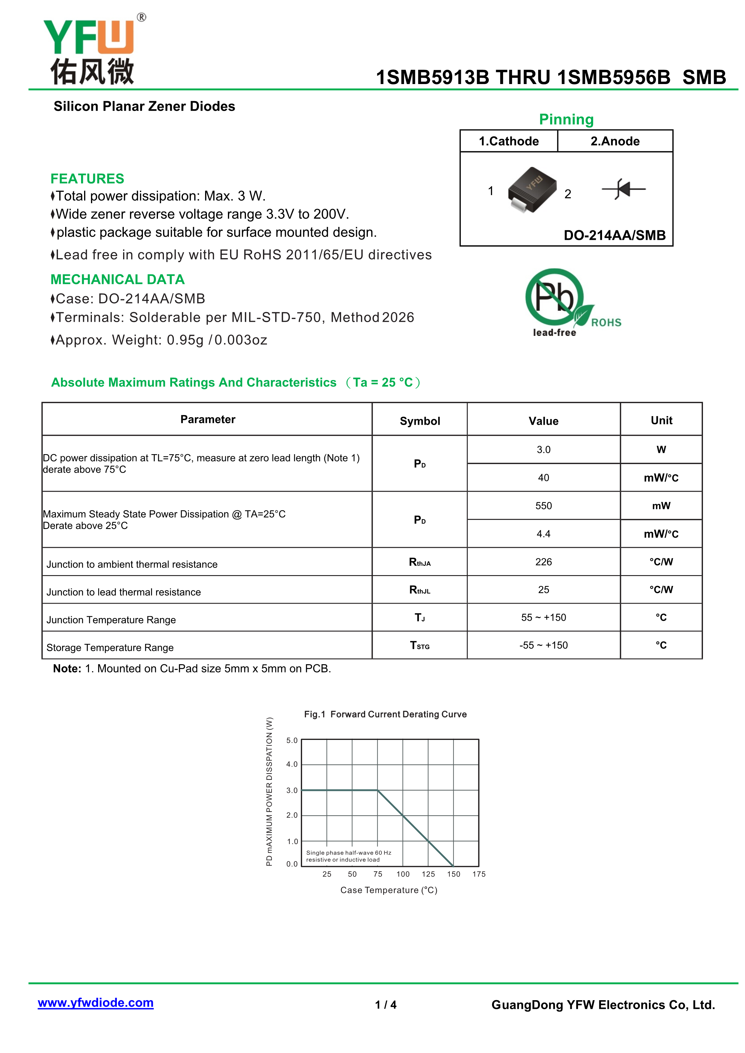 1SMB5934B数据手册SMB封装YFW(佑风微)PDF规格书,中英文下载