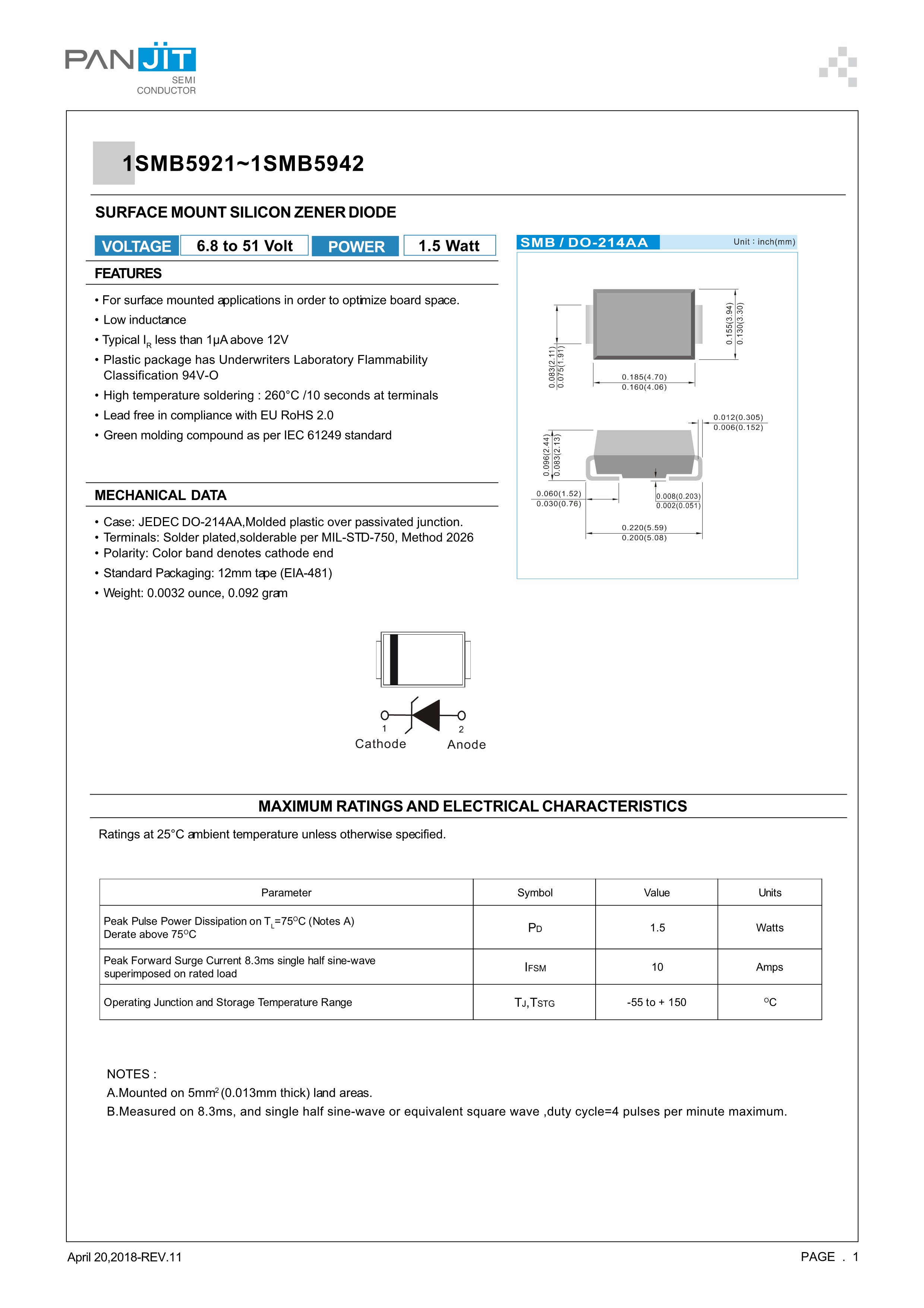 1SMB5939_R1_10001数据手册SMB封装PANJIT(强茂)PDF规格书,中英文下载