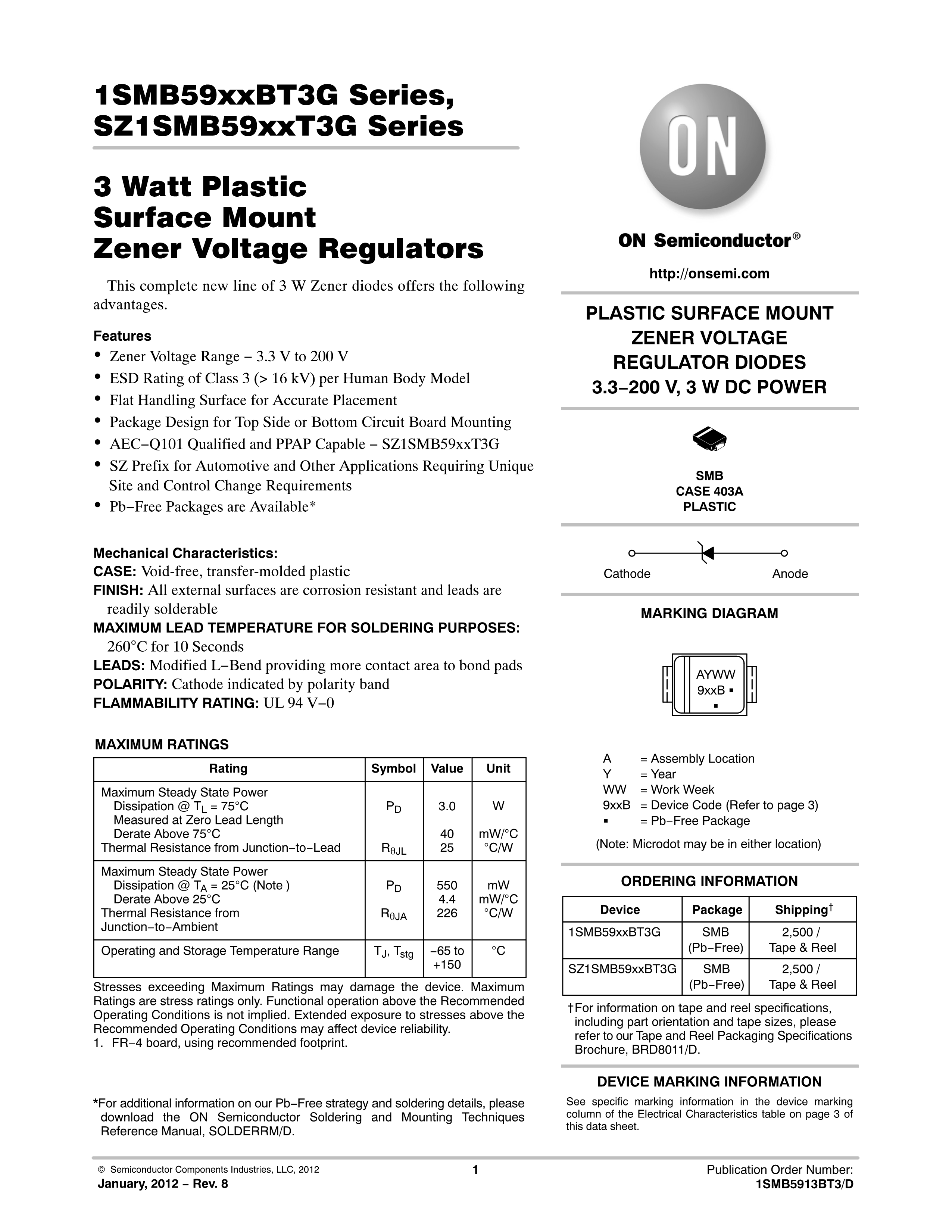 1SMB5931BT3G数据手册SMB(DO-214AA)封装onsemi(安森美)PDF规格书,中