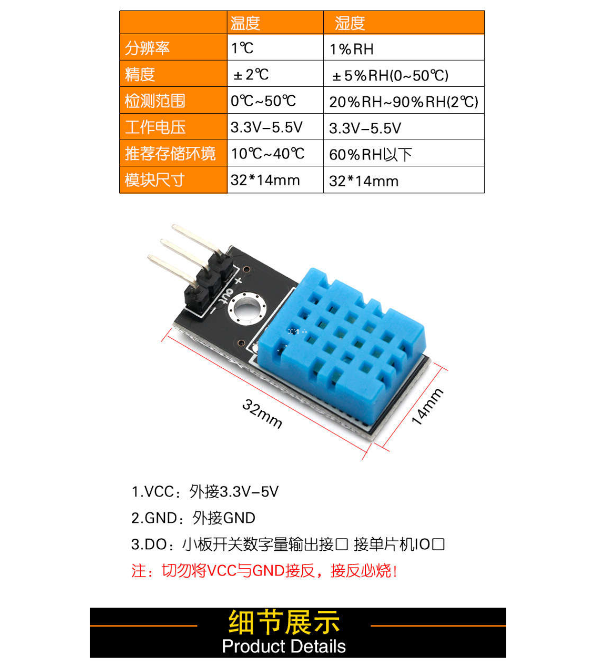DHT11温度模块 湿度模块 温湿度模块 DHT11传感器(送杜邦线)