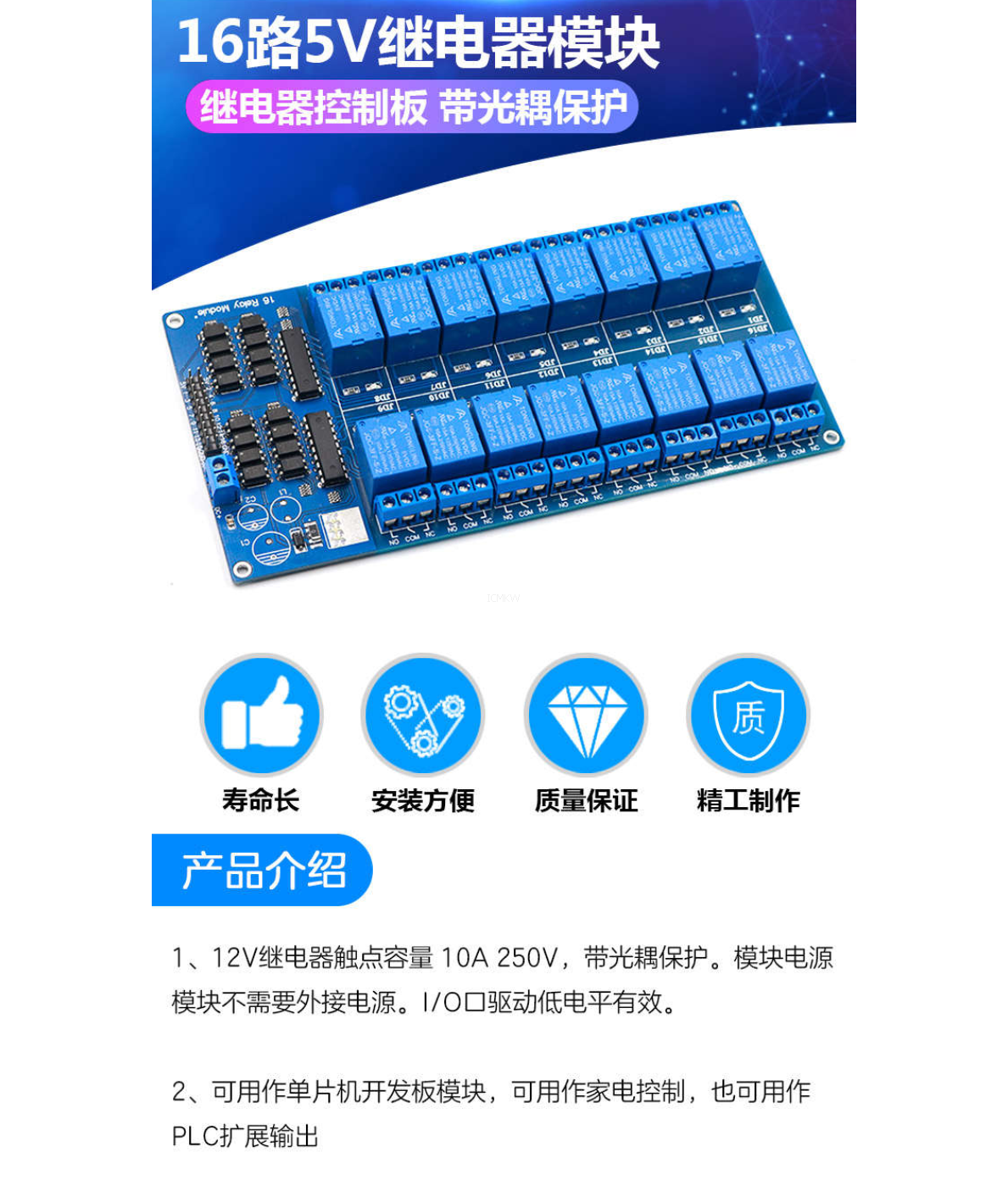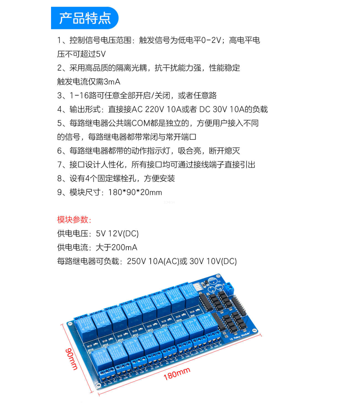 16路 5V 12V继电器模块 继电器控制板 带光耦保护 带LM2576电源