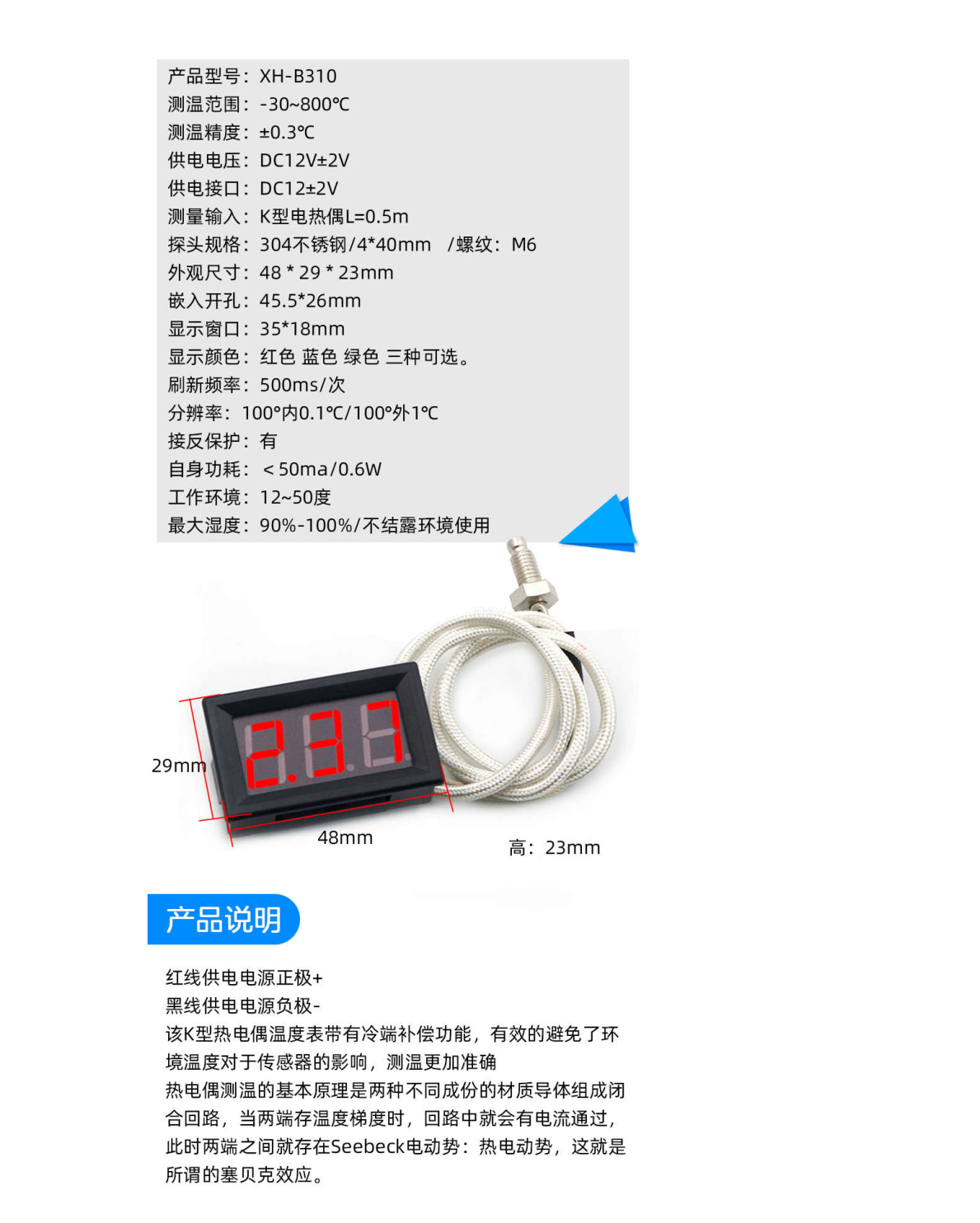 XH-B310 数显高温温度计 K型热电偶工业数字测温表 -30~800度
