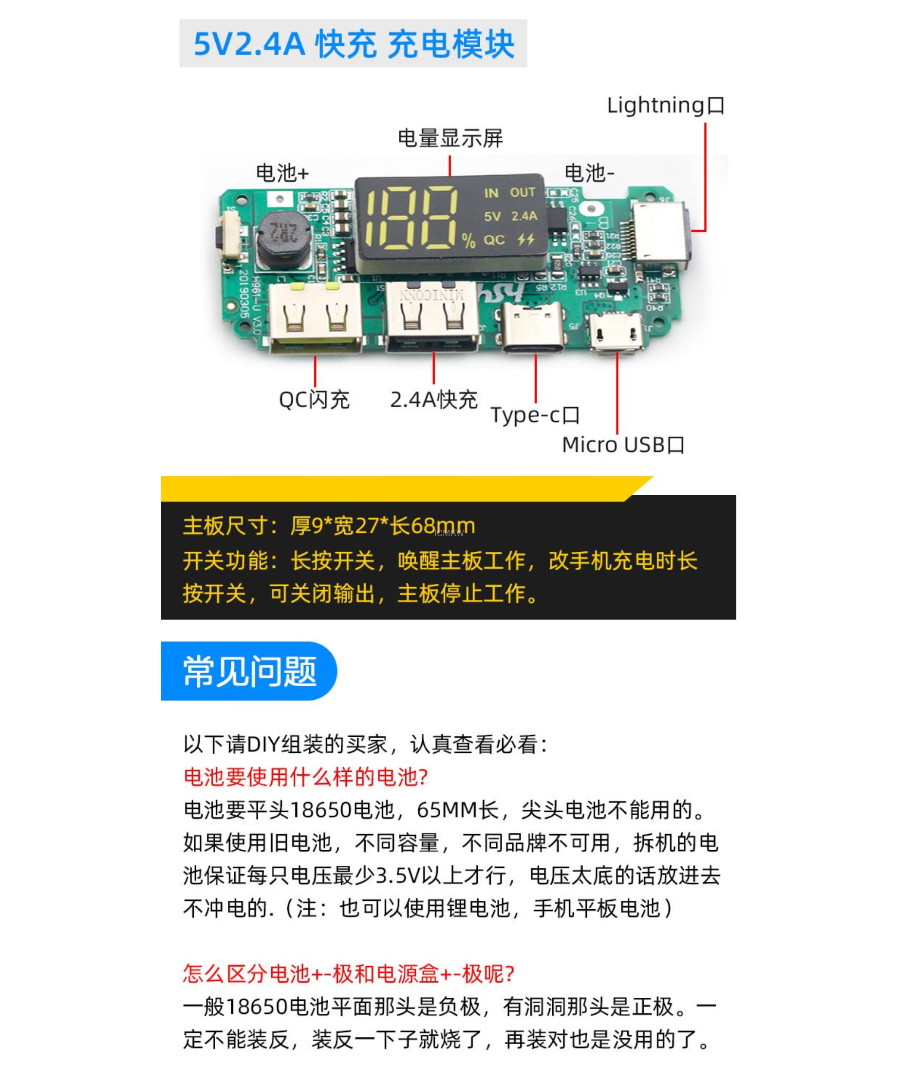 18650锂电池数显充电模块带显示 升压模块5V2.4A 2A 1A 双USB输出