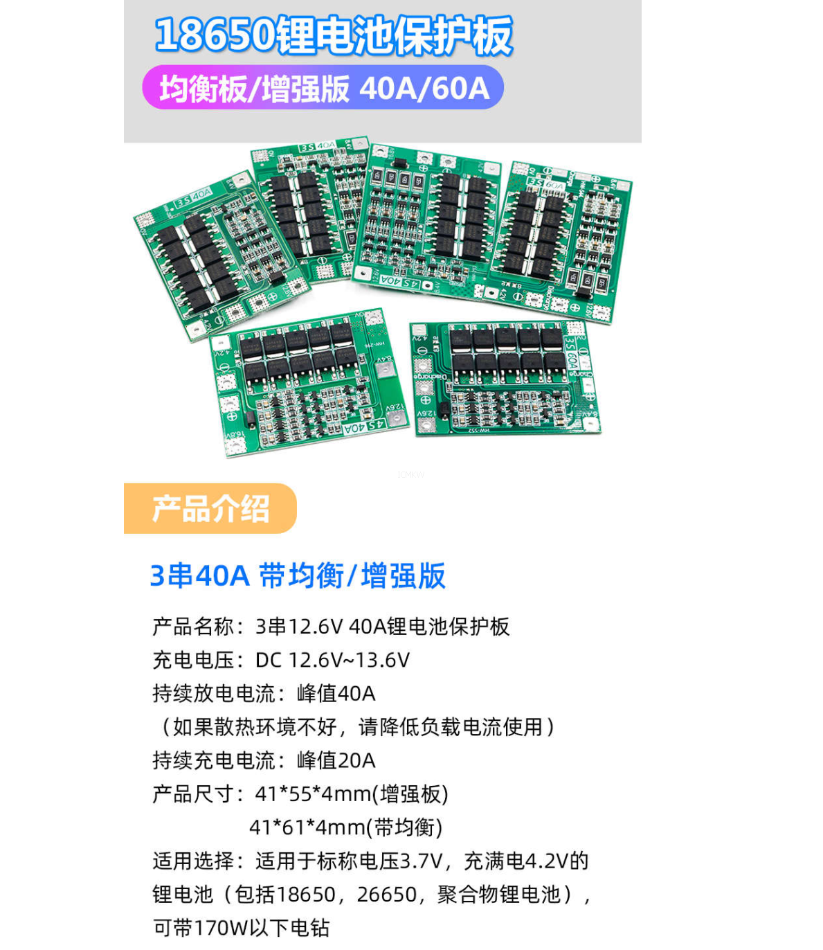 3串/4串 40A 60A锂离子电池充电器保护板均衡/增强版可启动电钻