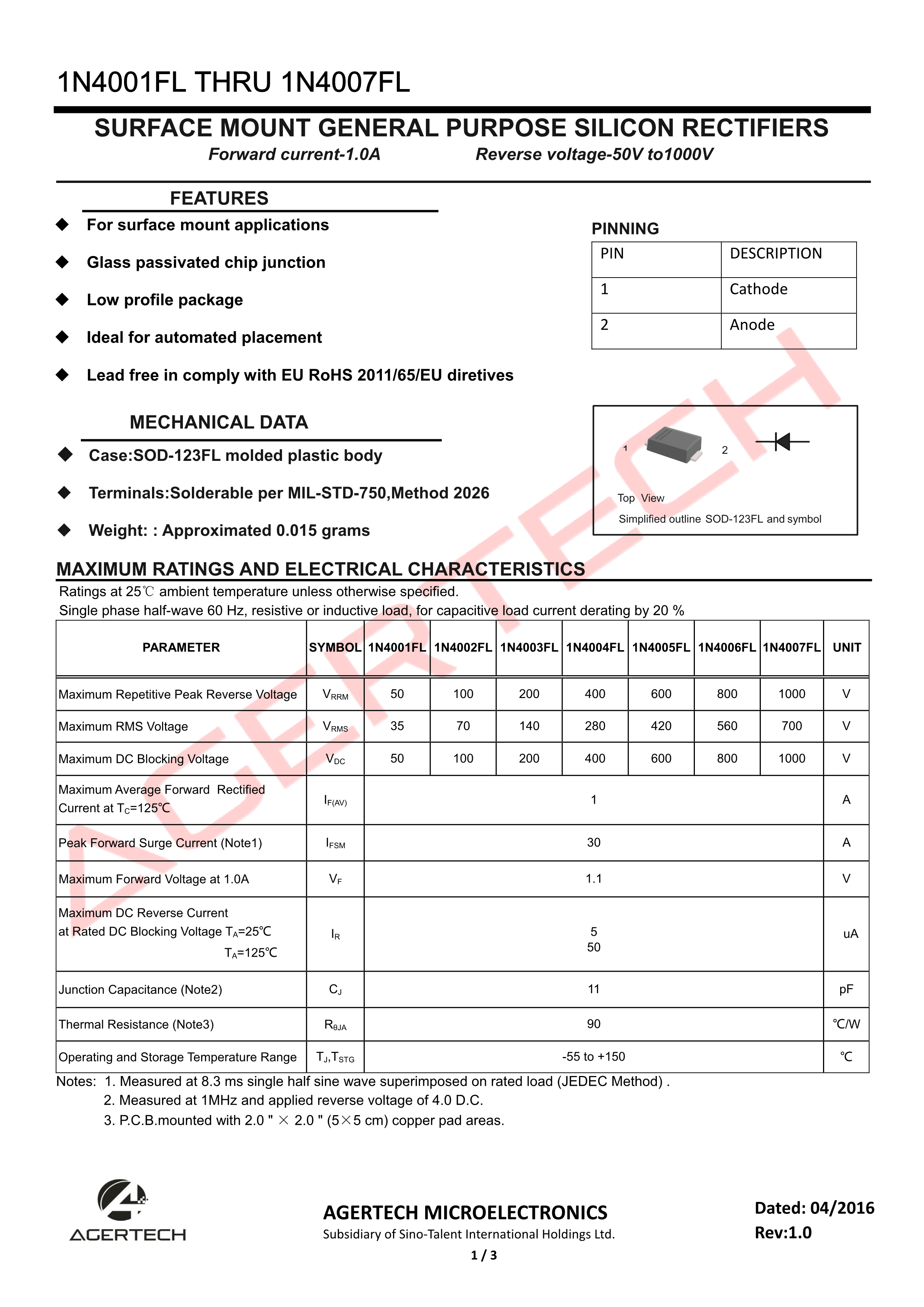 1N4007FL數據手冊SOD-123FL封裝Agertech(艾吉芯)PDF規格書,中英文下載