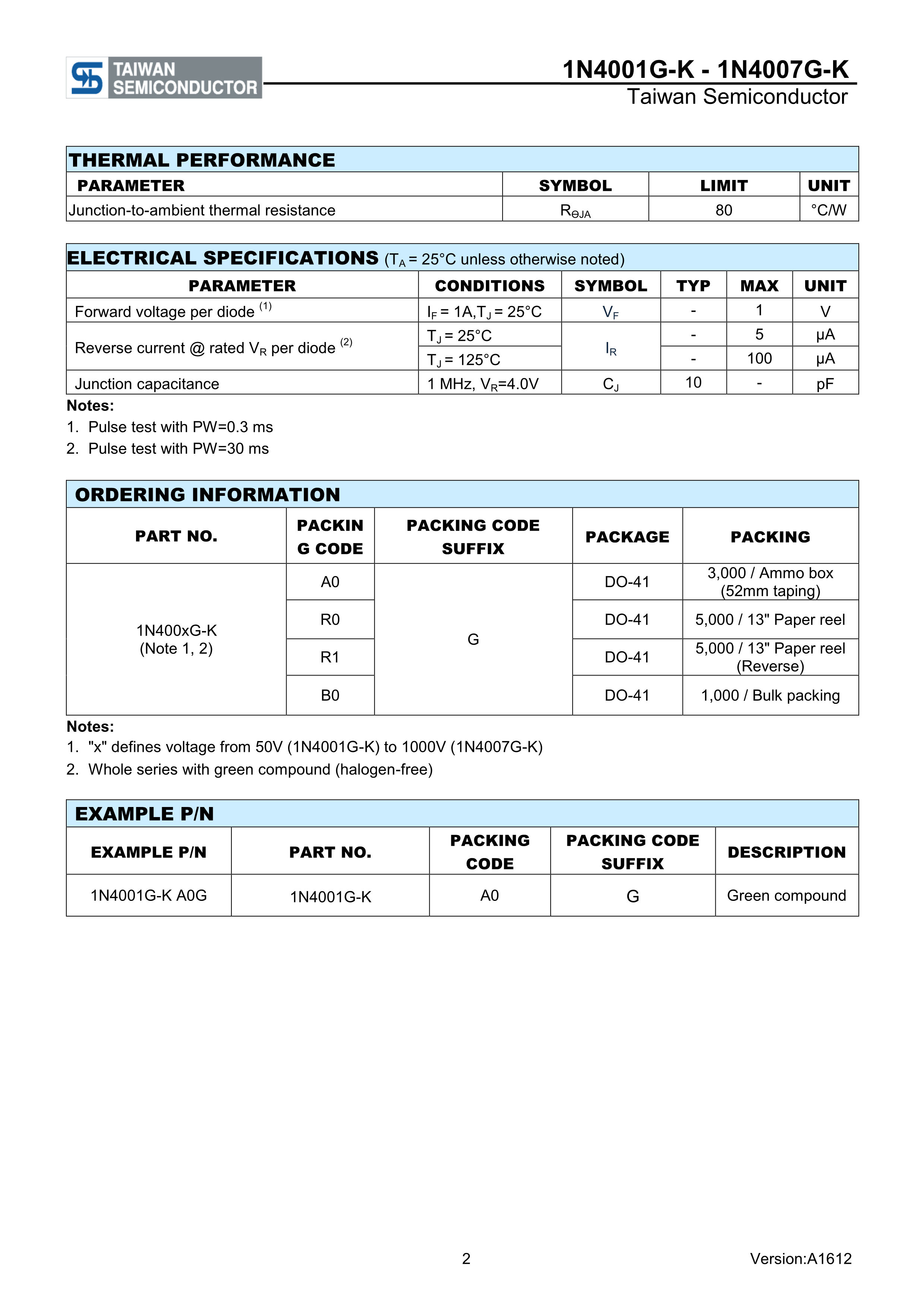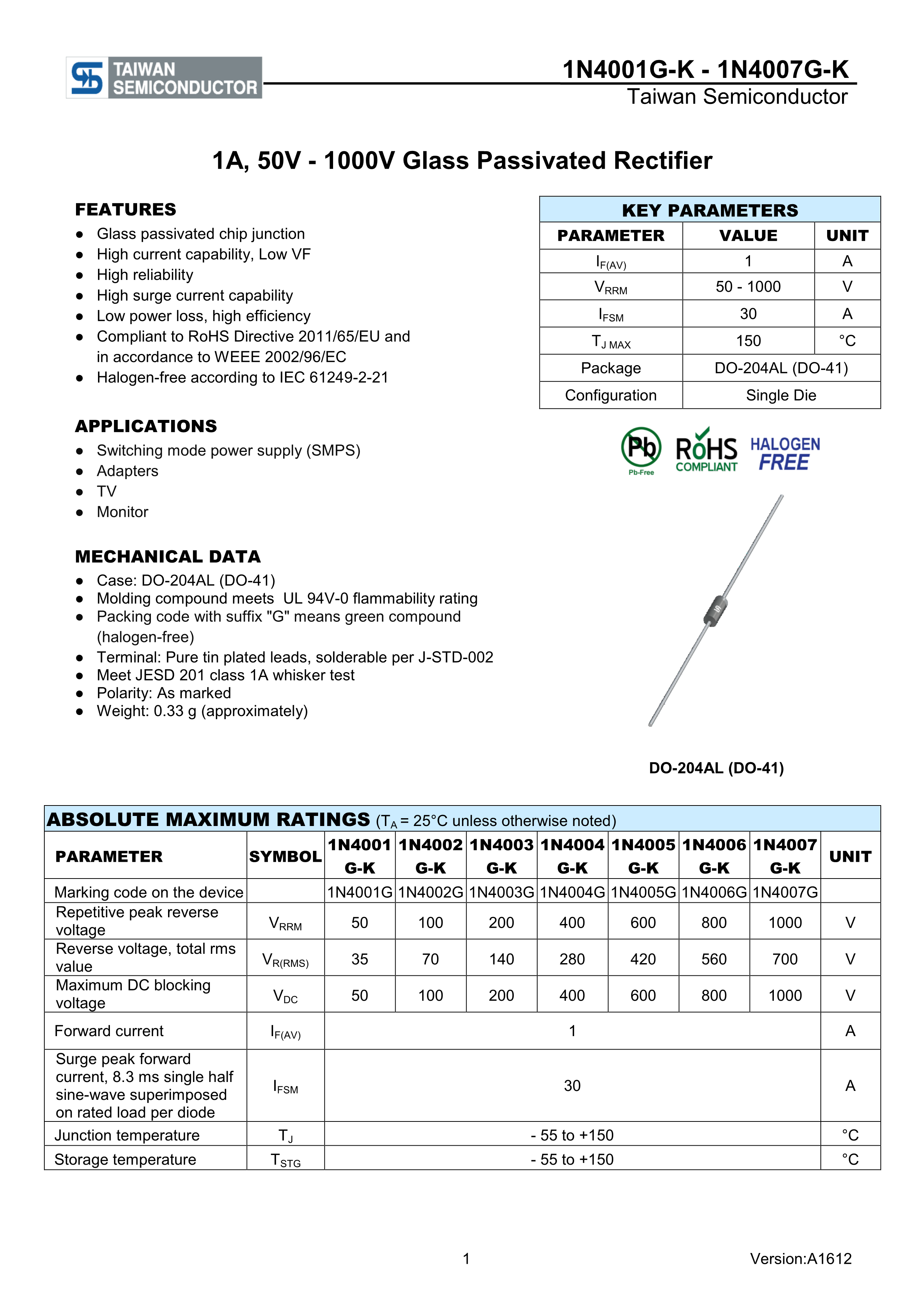 1N4007G-K數據手冊DO-204AL封裝Taiwan Semiconductor(颱灣半導體)