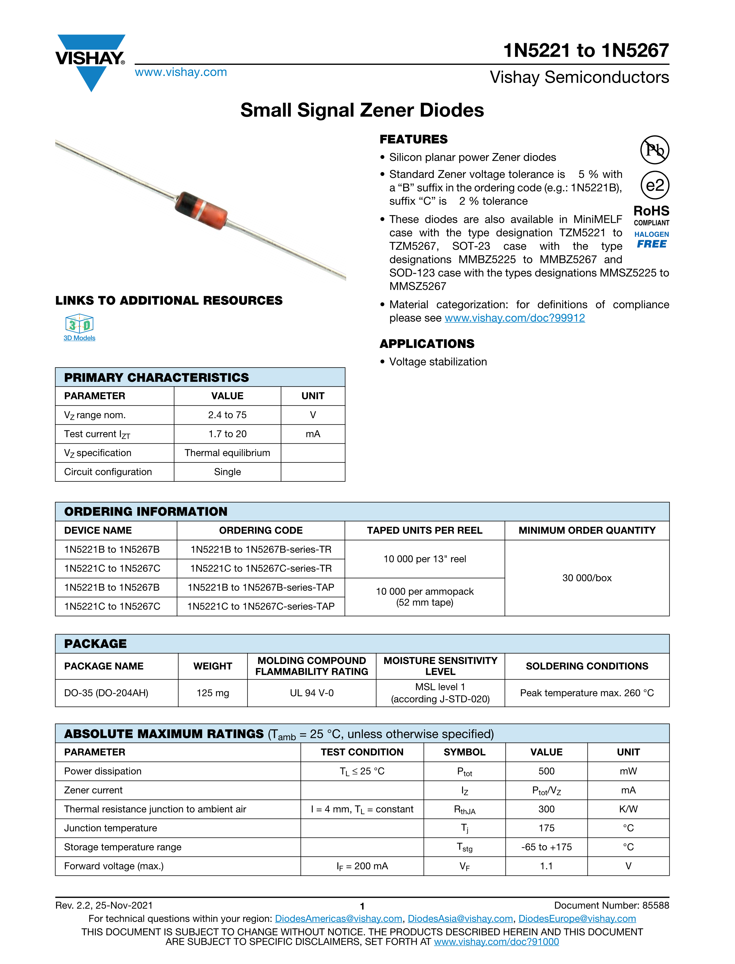 1N5262B-TR數據手冊DO-204AH封裝VISHAY(威世)PDF規格書,中英文下載