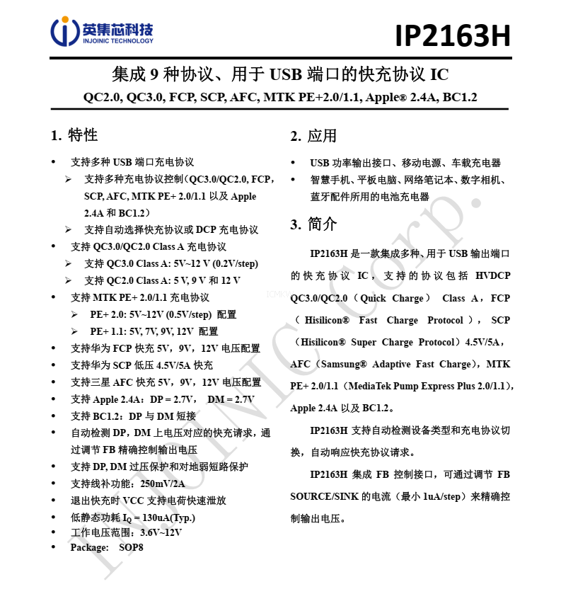 IP2163H,集成 9 種協議、用於 USB 端口的快充協議芯片規格書下載