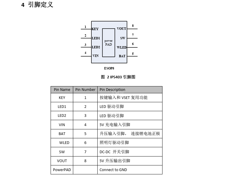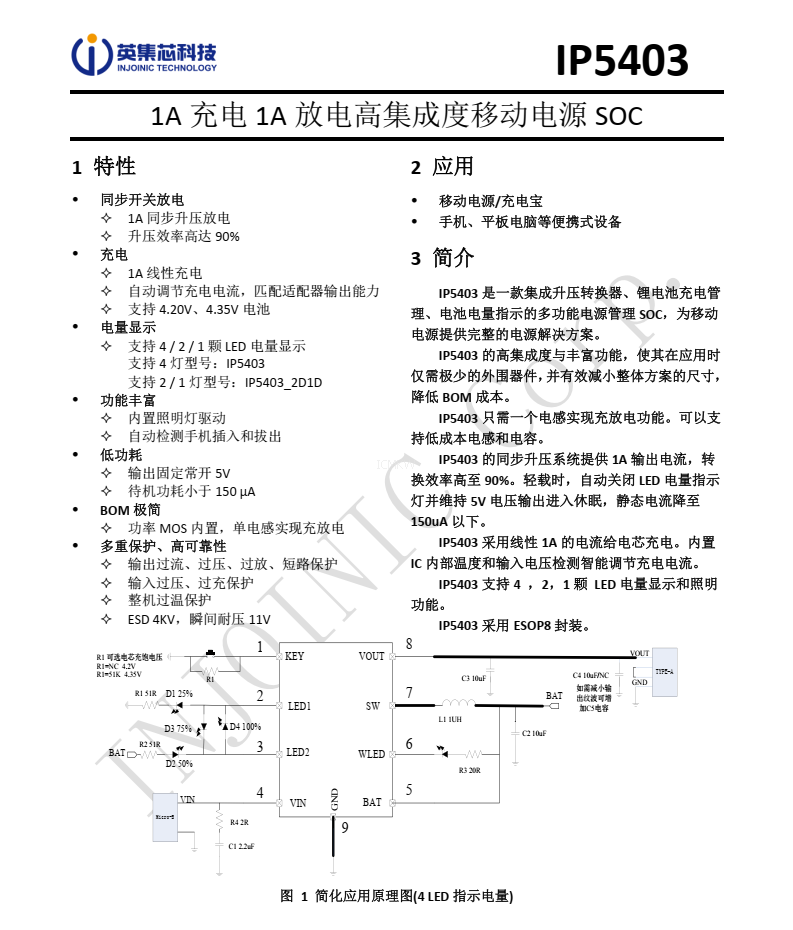 IP5403,1A 充電 1A 放電高集成度移動電源 SOC芯片規格書下載