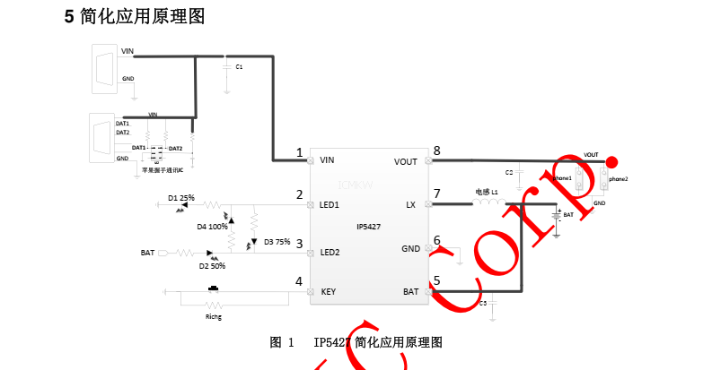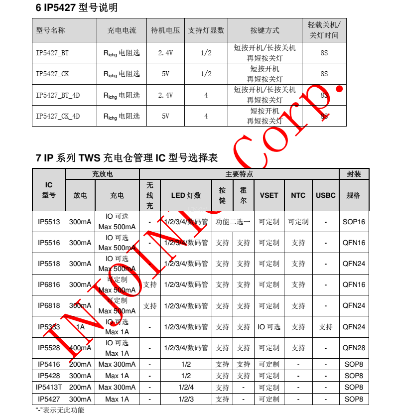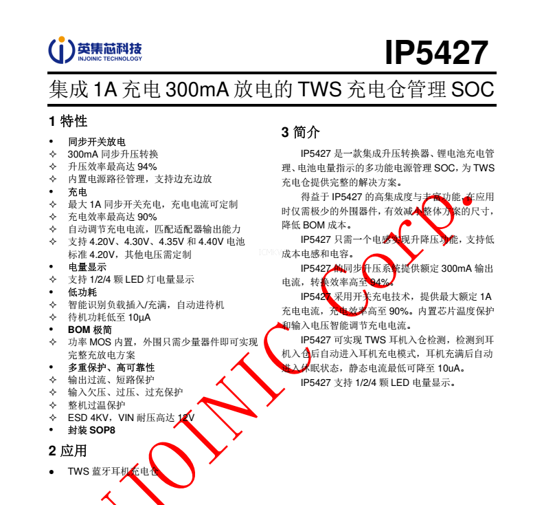 IP5427,集成 1A 充電 300mA 放電的 TWS 充電倉管理 SOC芯片規格書下載