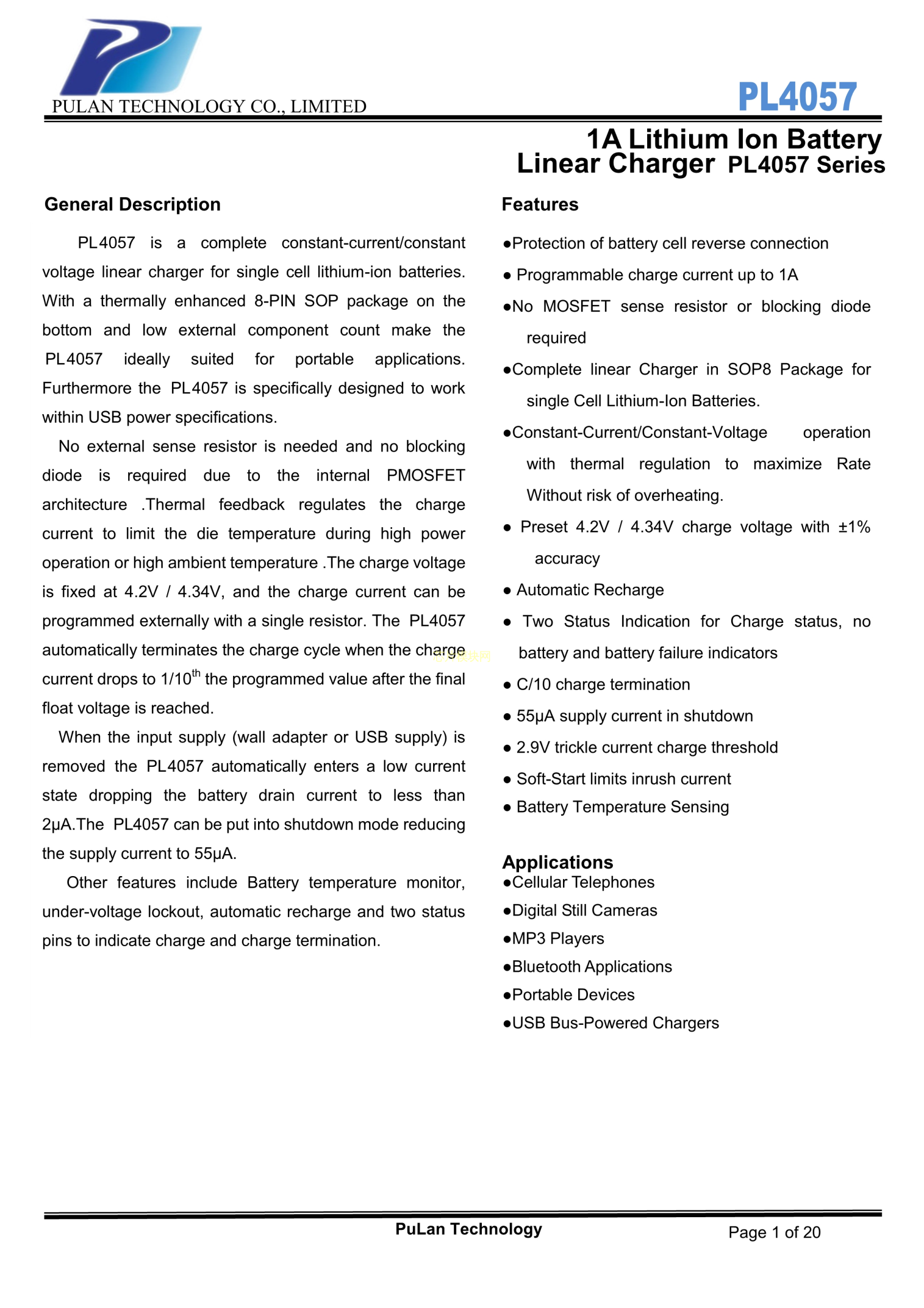 PL4057 香港普藍科技規格書,中英文下載
