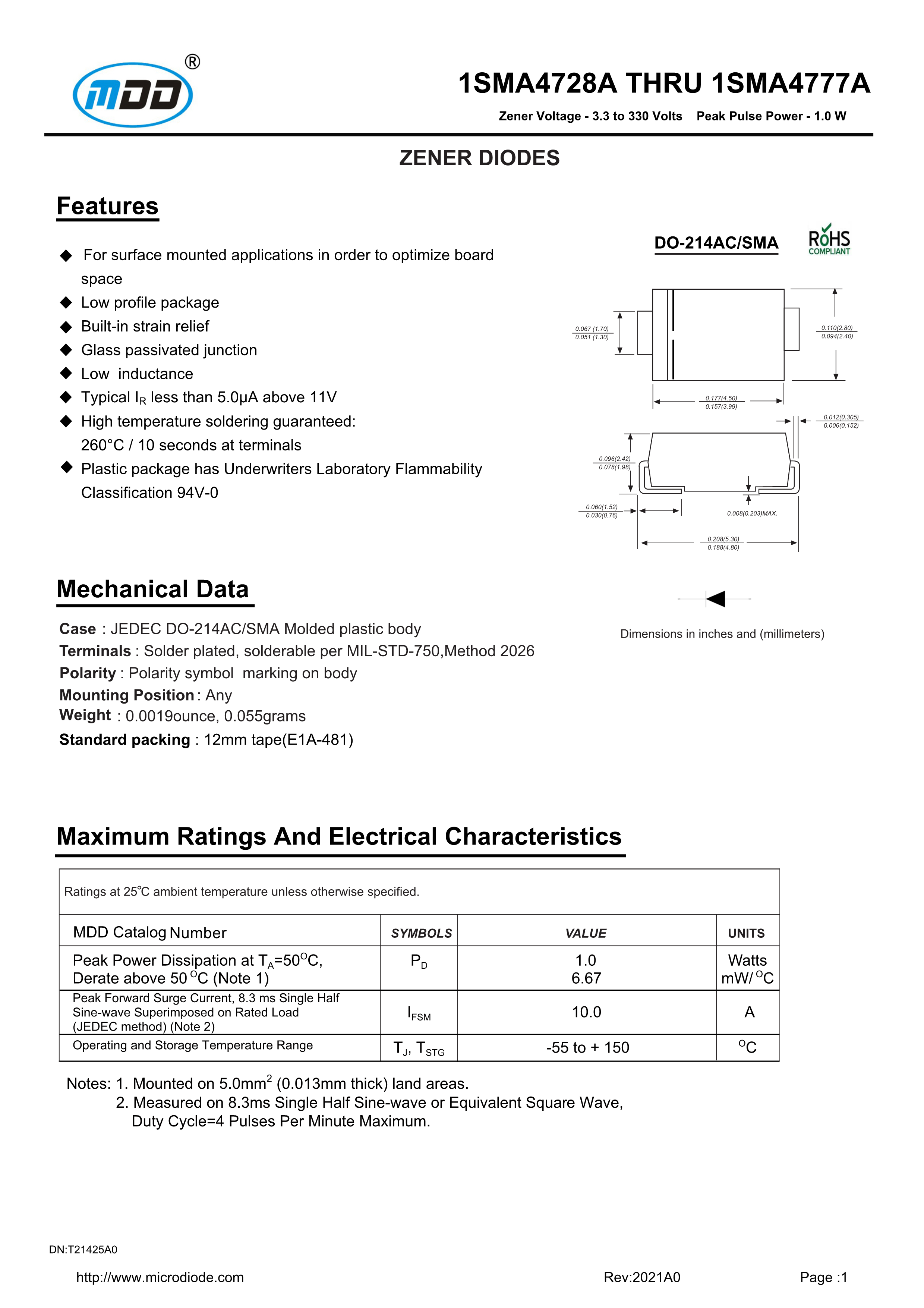1SMA4740A數據手冊SMA(DO-214AC)封裝MDDPDF規格書,中英文下載