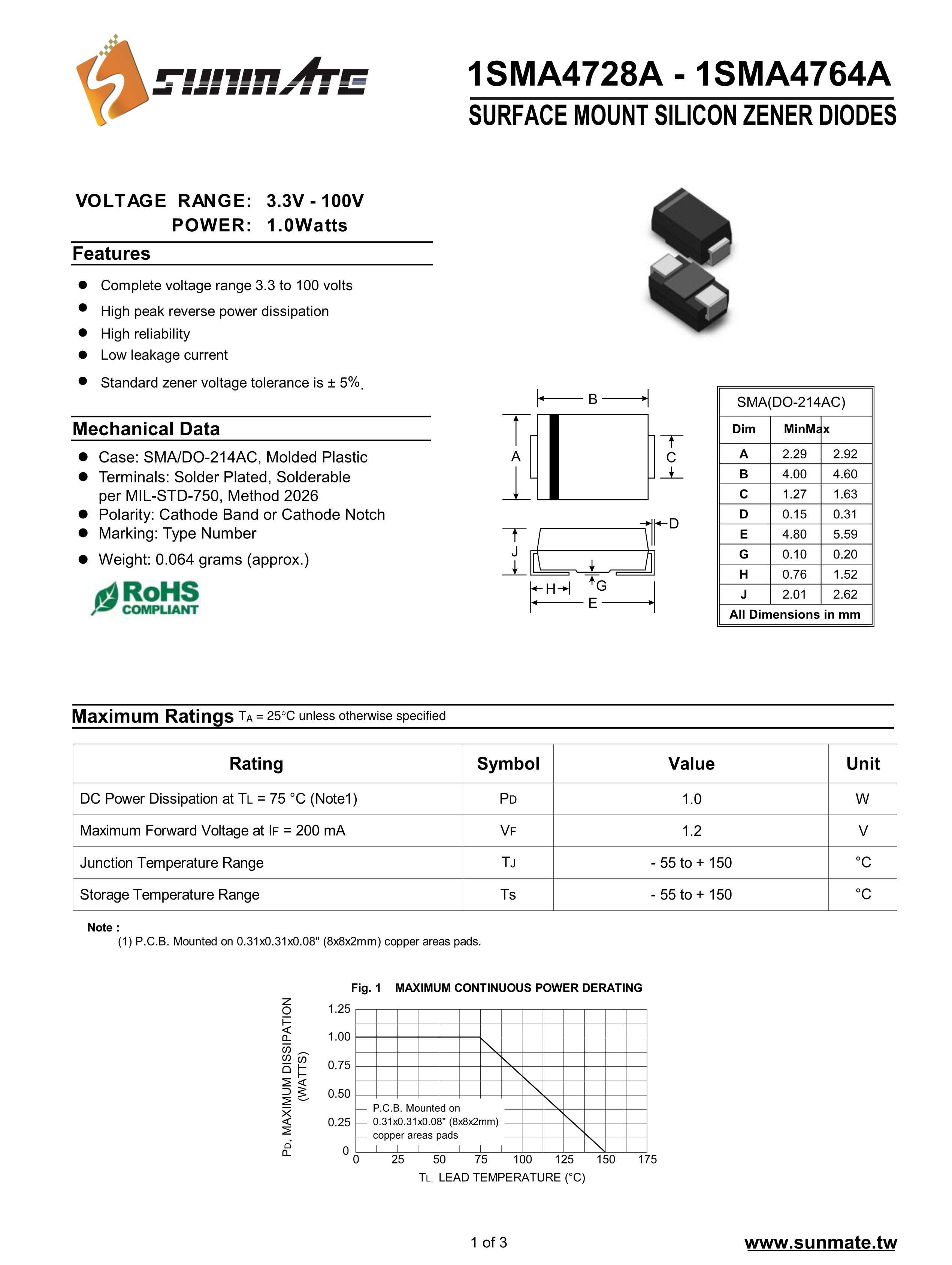 1SMA4740A數據手冊SMA(DO-214AC)封裝SUNMATE(森美特)PDF規格書,中英文